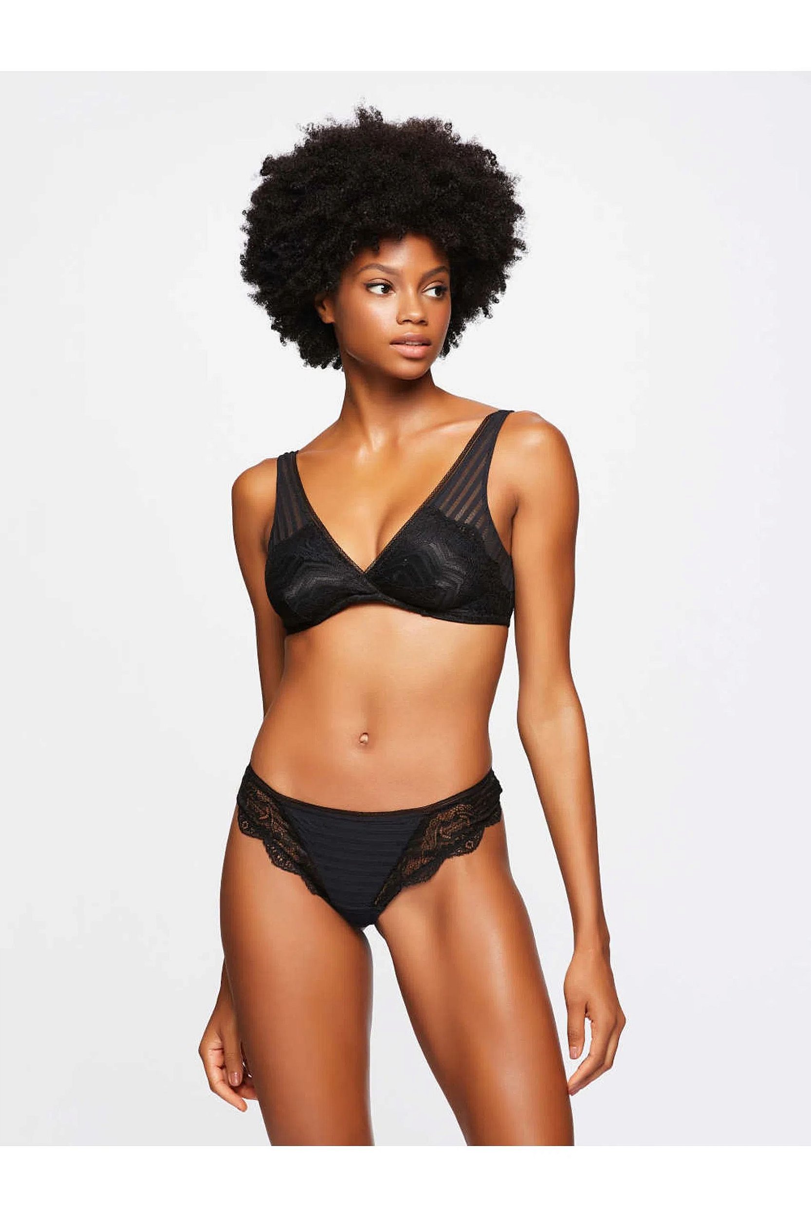 Tecidos: Renda: 87,62 % Poliamida e 12,38% Elastano. Microfibra Ambra: 84% Poliamida e 16% Elastano. Forro: 100% algodão em Bodies e Calcinhas.