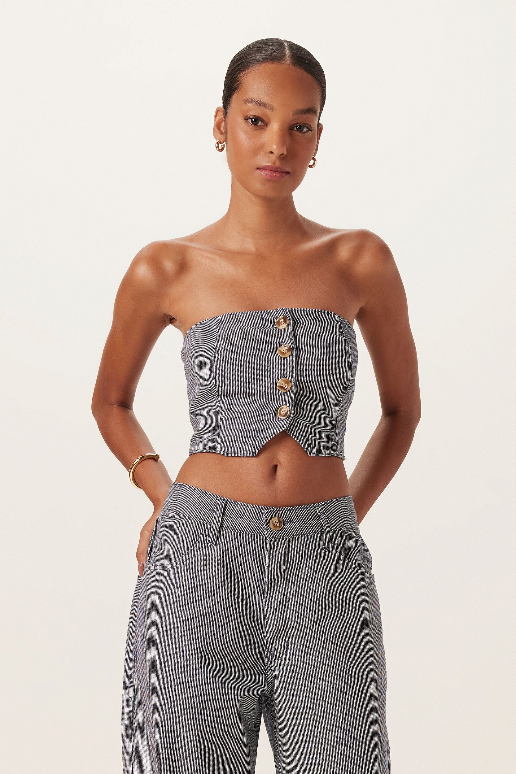 Compre o top tomara que caia jeans com listras jeans feminino dimy, feito 100% de algodão, para um look moderno e estiloso. perfeito para ser combinado com calças jeans ou saias, este top da dimy é uma escolha versátil e confortável. aproveite!