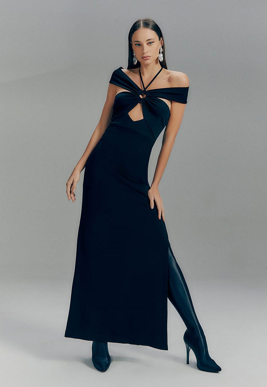 Vestido midi confeccionado em viscose, ombro a ombro com recortes estratégicos na região do busto dando sensualidade a peça, modelagem reta com fenda e fechamento posterior em zíper. Lindo e elegante.