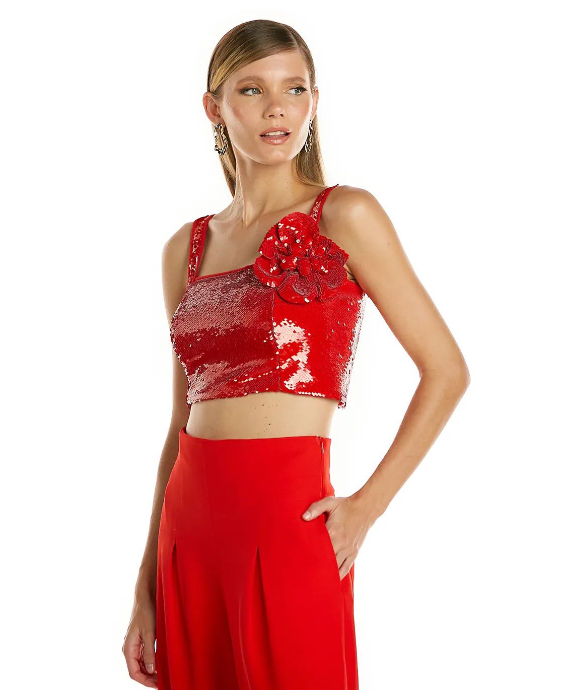 Top de paetê, alças finas, decote quadrado, fechamento em zíper. Acompanha flor de broche.